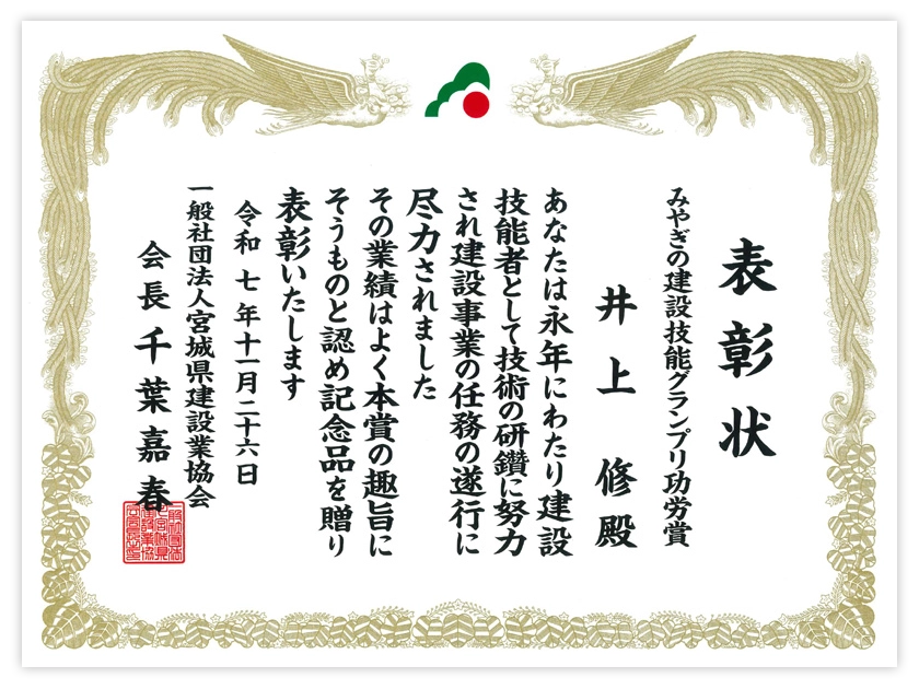 2025.12.12このたび弊社社員が、「みやぎの建設技能グランプリ功労賞」を受賞しました。