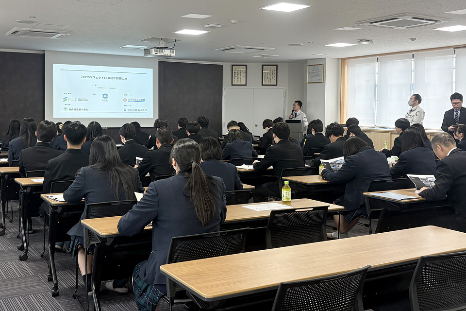 2026.03.23令和8年3月17日に宮城県古川工業高等学校建築科の皆様が弊社社屋の見学に来訪され、『ZEB』と事務所建築に関する事例を学んで頂きました。